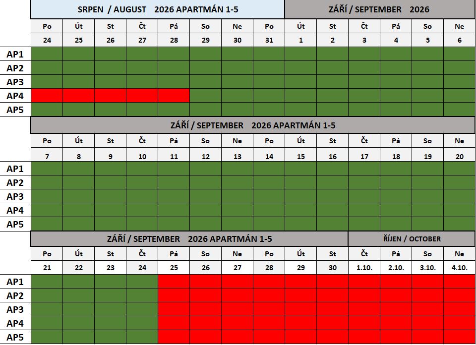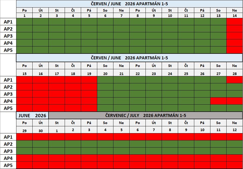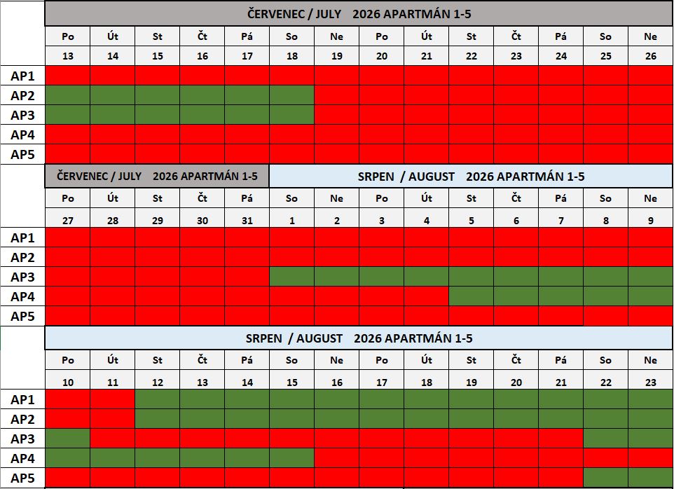 VOLNÁ KAPACITA v SEZÓNĚ 2026 Aktualizace volné kapacity probíhá denně ve 21.00 hod zelené pole – volná kapacita červené pole – obsazeno
